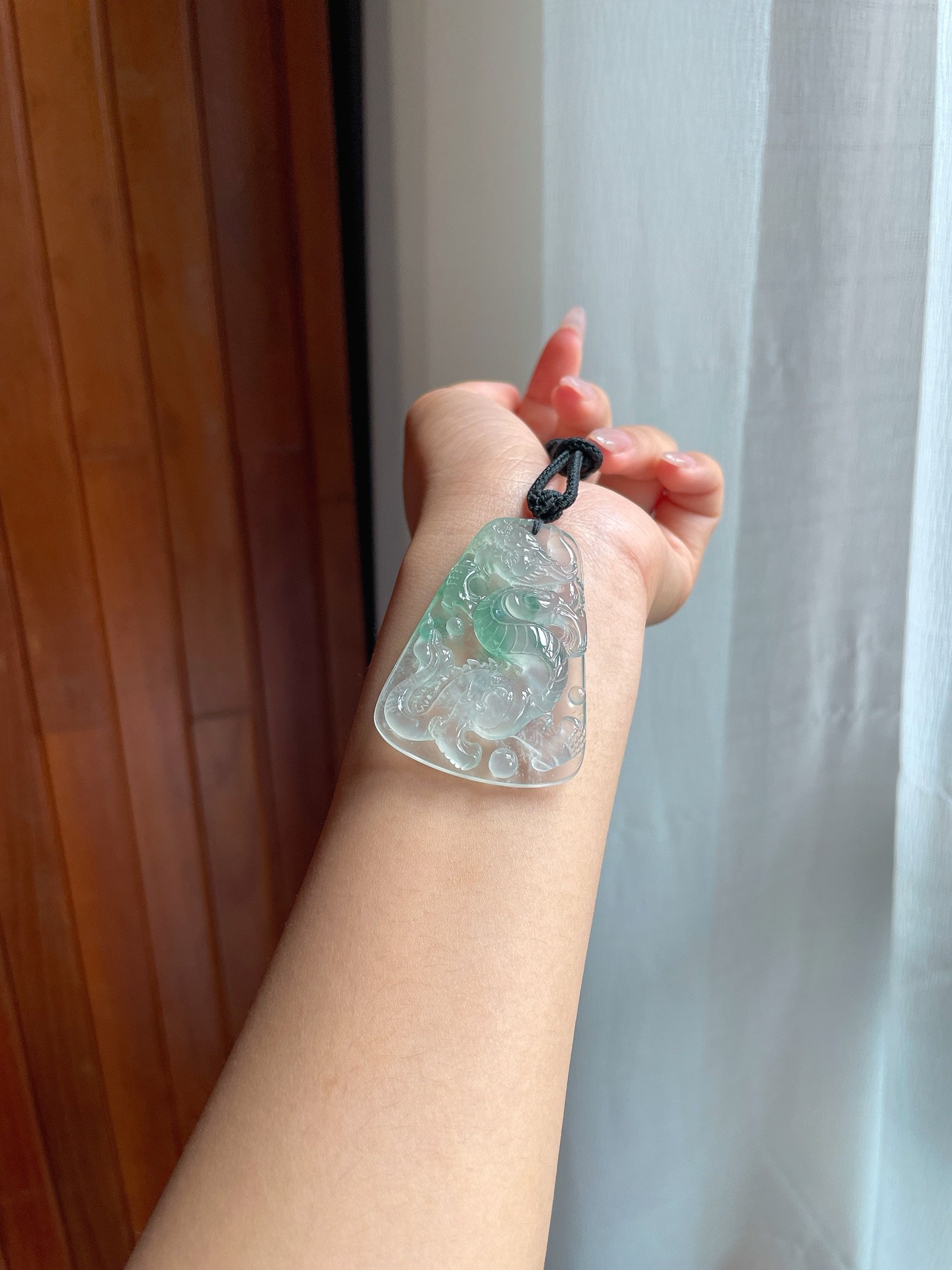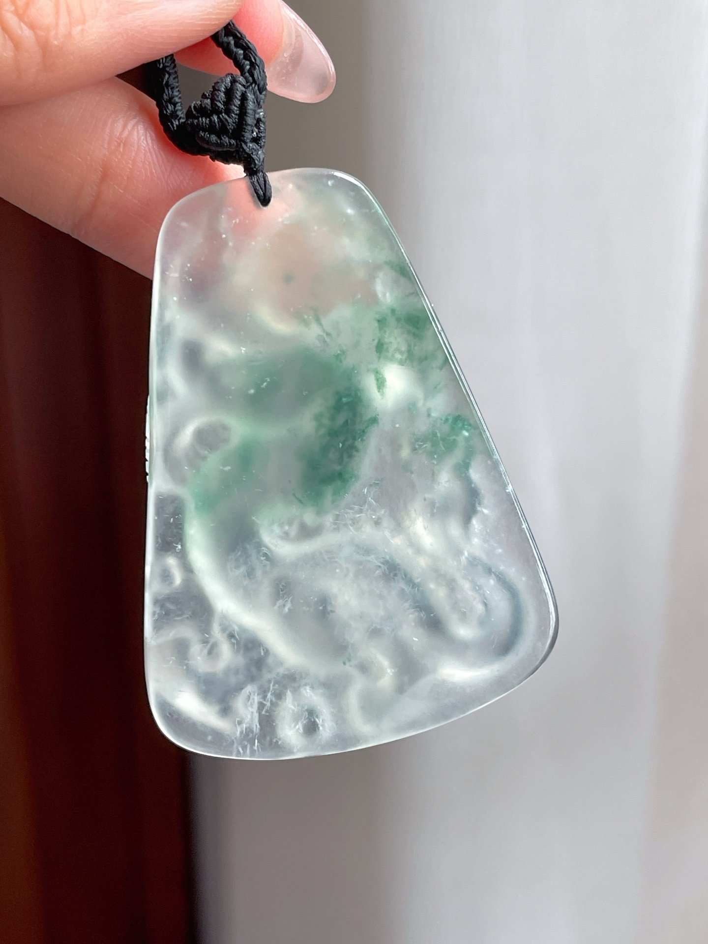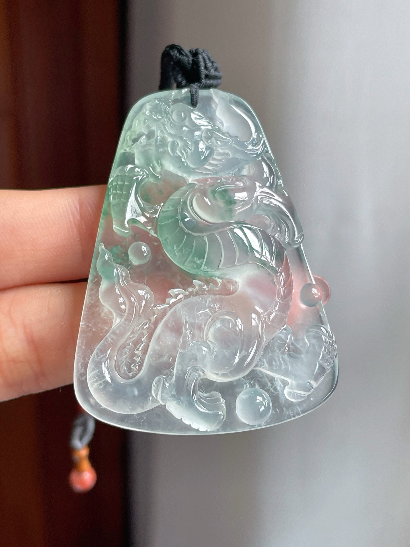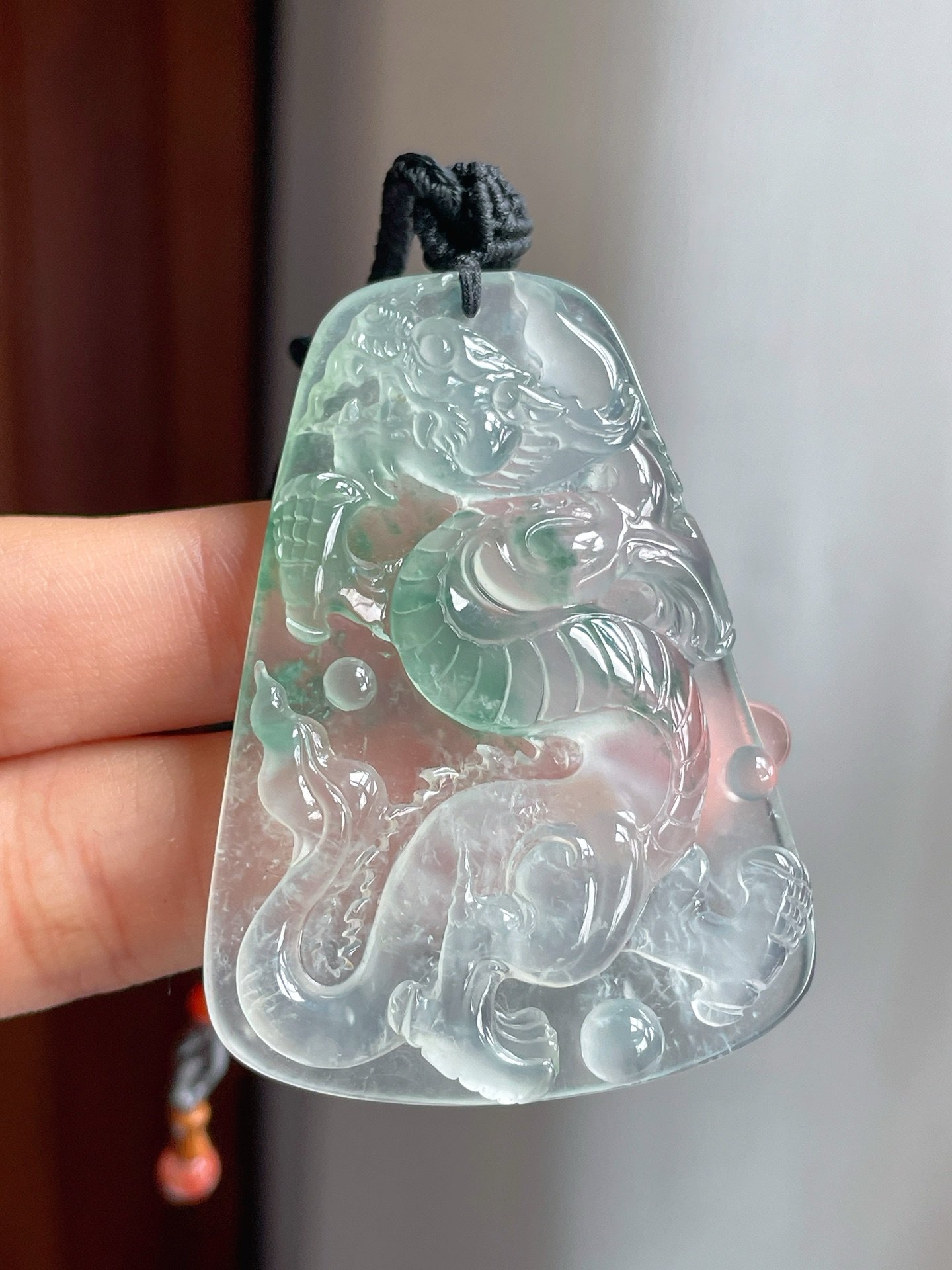 这款挂件注重雕刻细节,龙的鳞片、爪部以及精致的面部刻画都展现了匠人非凡的技艺。冰玻种翡翠作为雕刻材料,其自然晶莹剔透的特性,结合飘花的色彩点缀,为挂件增添了更多层次感。这种天然材质不仅美观,还具有收藏升值潜力,是兼具实用与艺术价值的佳选。