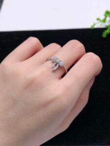 翡翠蝴蝶结戒子是一件真正融合优雅与自然的饰品。它的设计以蝴蝶结的柔美线条为灵感,搭配高品质翡翠,为佩戴者增添灵动的气质。这款戒指不仅体现着传统东方文化的独特魅力,还带有现代时尚的简约感,无论是日常搭配还是特别场合,都能完美契合。